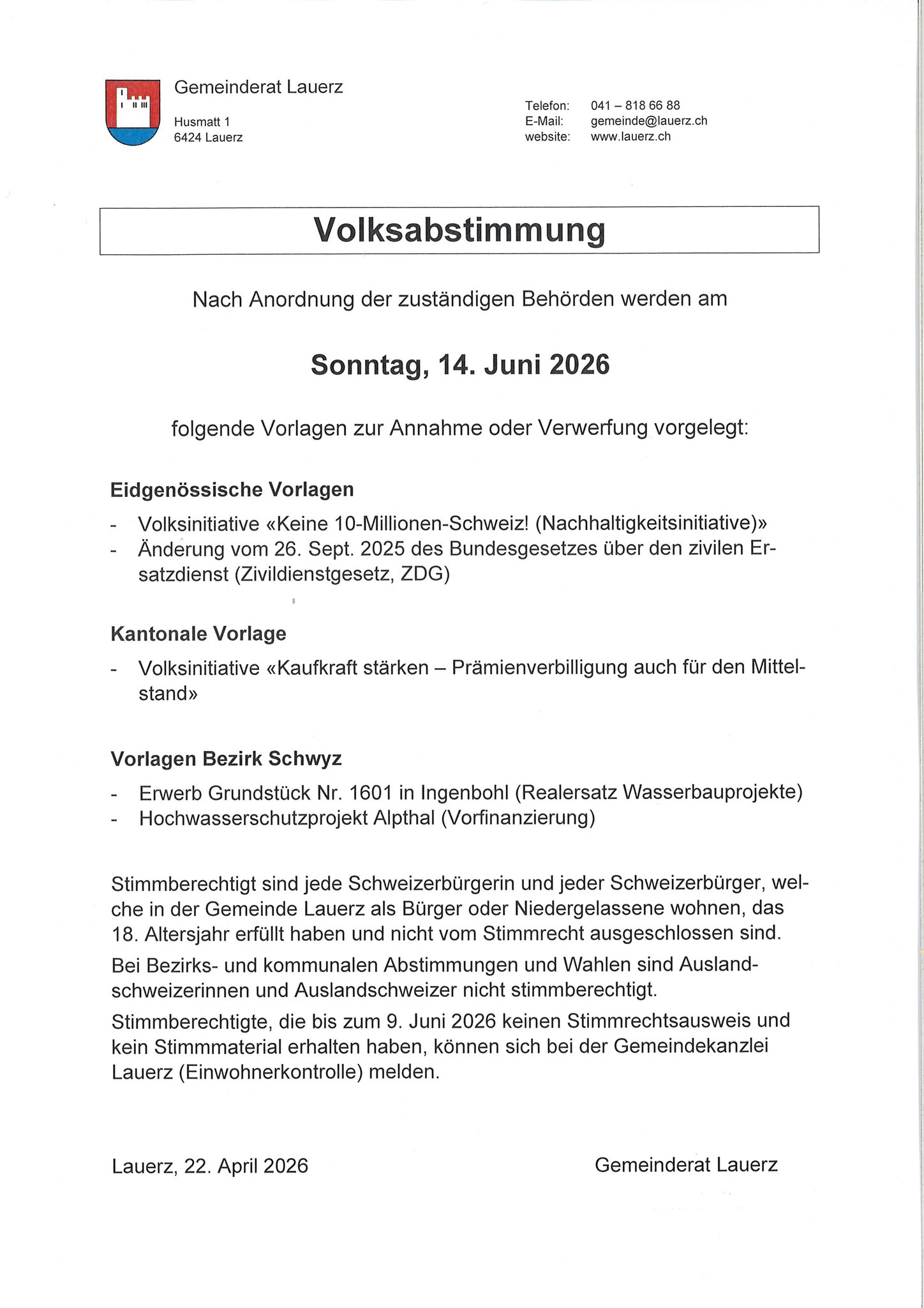 Startseite Aktuelles Abstimmung vom 14. Juni 2026 Abstimmung vom 14. Juni 2026 21. April 2026 Kontakt Gemeindeverwaltung LauerzHusmatt 16424 Lauerz+41 41 818 66 88 gemeinde@lauerz.ch Weitere News Gemeinderatswahlen vom 19. April 2026 19. April 2026 Umbau Bushaltestelle Dorf, Lauerz 08. April 2026 lnformation zur Asiatischen Hornisse im Kanton Schwyz 31. März 2026 Inhalt