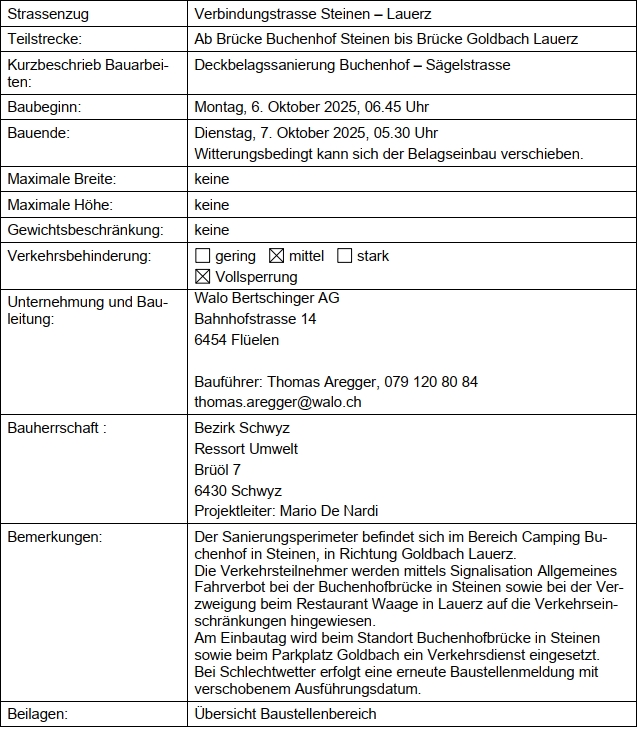 Startseite Aktuelles Baustellen Meldung: Verbindungstrasse Steinen - Lauerz Baustellen Meldung: Verbindungstrasse Steinen - Lauerz 02. Oktober 2025 Kontakt Gemeindeverwaltung LauerzHusmatt 16424 Lauerz+41 41 818 66 88 gemeinde@lauerz.ch Weitere News Ergebnisse eidgenössische Volksabstimmung vom 28. September 2025 28. September 2025 Ergebnis kantonale Volksabstimmung vom 28. September 2025 28. September 2025 Gesucht: Neues Organisationsteam ab 2026 für die Samichlausgruppe Lauerz 23. September 2025 Inhalt