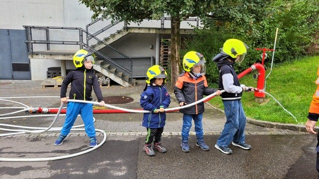 Die zweite Gruppe hörte den drei langjährigen Feuerwehrmänner Kai, Thierry und Thomas zu. Auch sie haben für die Kinder ein großartiges Programm zusammengestellt.