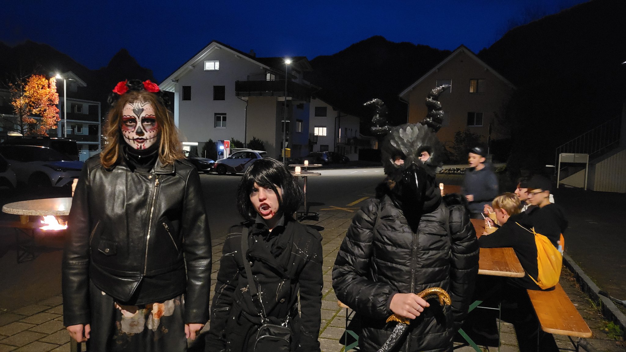 Wir sind einfach überwältigt, wie diese zwei Stunden Anklang bei der Bevölkerung finden und wir so ein bisschen das Dorfleben bereichern können. Vom Treffpunkt aus schwärmten die mehr oder weniger grusligen Gestallten aus, zogen von Tür zu Tür und erbettelten mit einem gruseligem Spruch Süssigkeiten oder sonst kleine Aufmerksamkeiten. Wie aufregend es doch ist, durch die Quartiere zu ziehen und zu sehen, wie sich die einen Lauerzer ins Zeug legten um die Häuser unheimlich gespenstig zu gestallten. Diverse Kürbisdekorationen, hier eine Nebelmaschine, da eine Puppe, welche erhängt wurde oder Gruselfiguren welche einem fast das Fürchten lehrten. Aufgeregt und happy kamen die Kinder mit gefüllten Taschen zurück.
