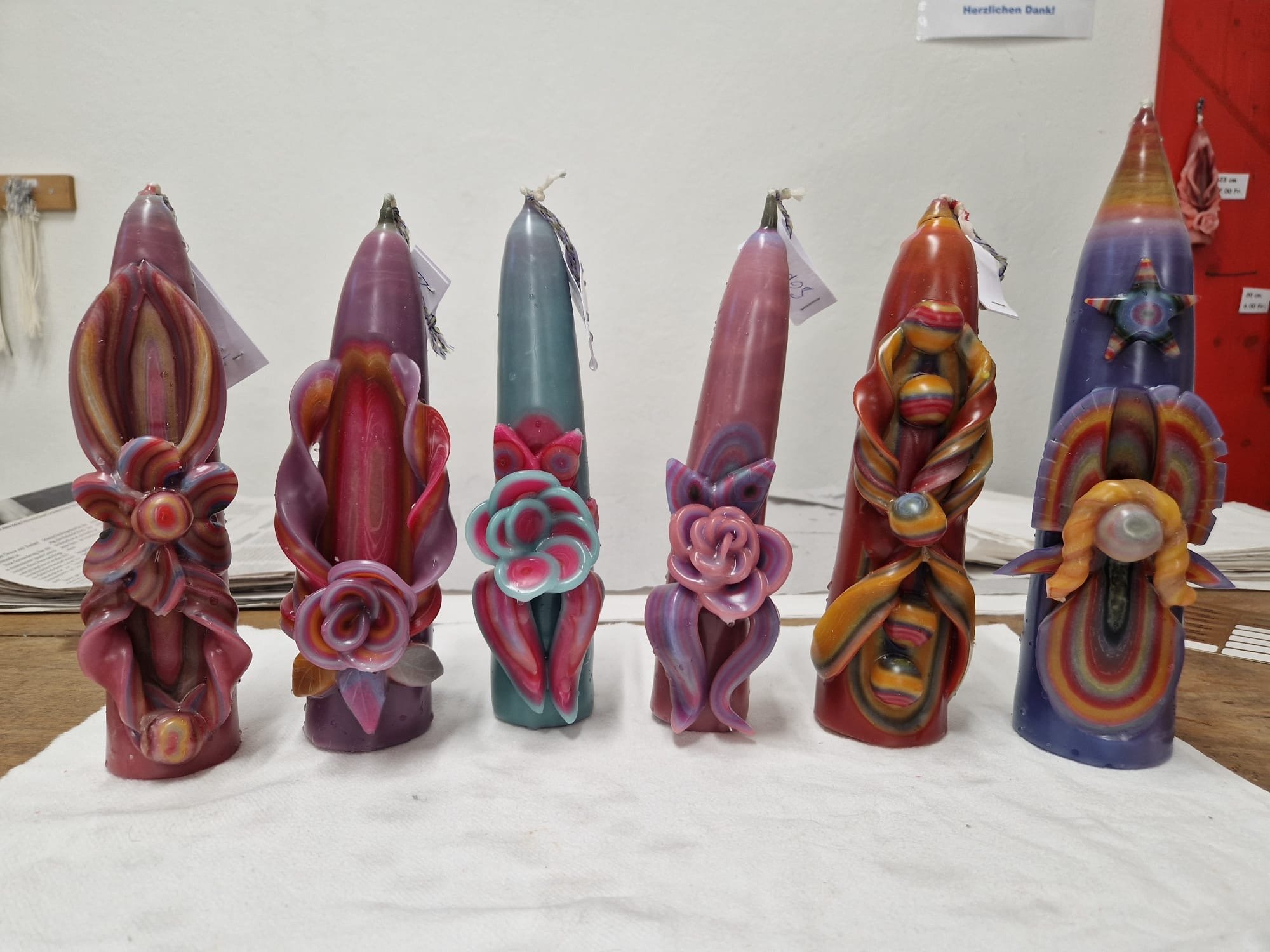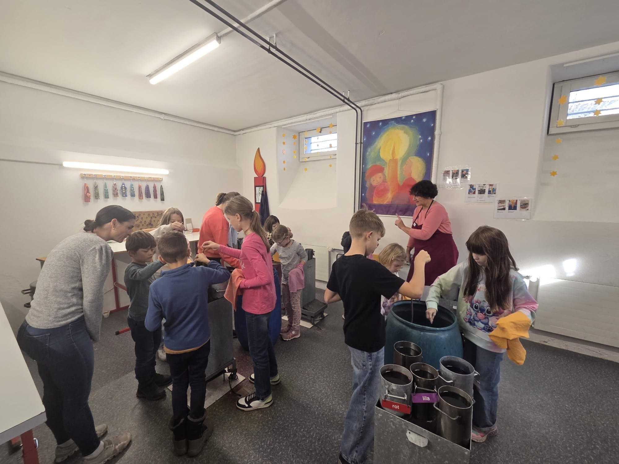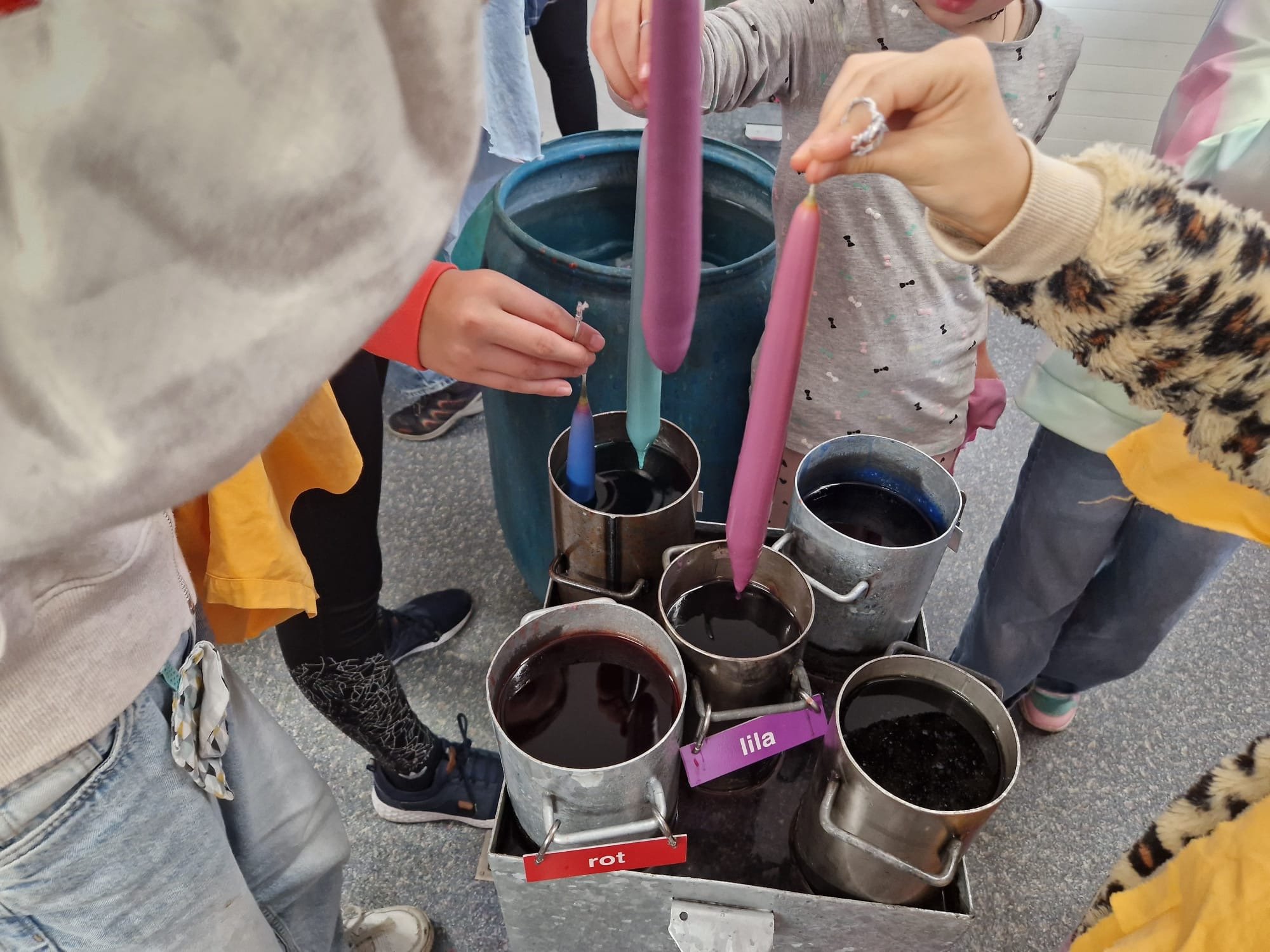 Vier freundliche Helferinnen empfingen uns und erklärten den Kindern, wie man eine Kerze richtig zieht. Der dünne Docht musste gut festgehalten und vorsichtig in die Töpfe mit flüssigem Wachs getaucht werden. Zur Auswahl standen 15 Farben, die Schicht für Schicht aufgetragen wurden. Nach jedem Eintauchen kam die Kerze kurz ins kalte Wasserbad, damit das Wachs aushärten konnte.