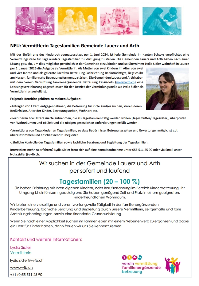 Startseite Aktuelles NEU: Vermittlerin Tagesfamilien Gemeinde Lauerz und Arth NEU: Vermittlerin Tagesfamilien Gemeinde Lauerz und Arth 09. Dezember 2025 Kontakt Gemeindeverwaltung LauerzHusmatt 16424 Lauerz+41 41 818 66 88 gemeinde@lauerz.ch Weitere News DER SAMICHLAUS BESUCHTE DIE LAUERZER FAMILIEN AM 5. UND 6. DEZEMBER 2025 09. Dezember 2025 Zusammenarbeit Gersau und Lauerz im Bereich Bauverwaltung 05. Dezember 2025 Chlausabend 2025 der Mitte 04. Dezember 2025 Inhalt
