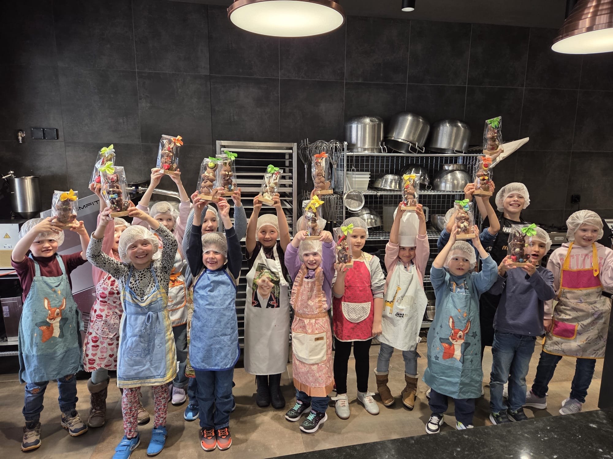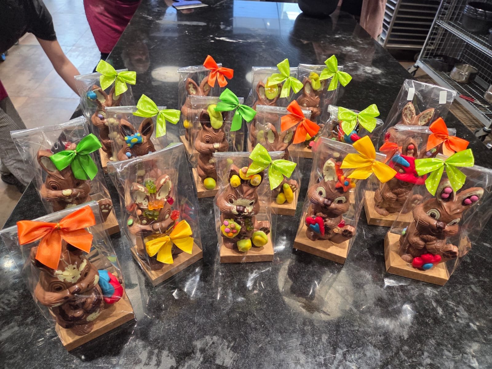 Als erstes durften die Kinder kleine Tütchen gefüllt mit ihrer ausgewählten temperierten Schokolade (weiss oder schwarz) den Hasen verzieren. Schnell musste gearbeitet werden und kein Hase sah am Schluss gleich aus.