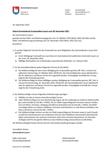 - Dekret Gemeinderats Ersatzwahlen Lauerz vom 28. November 2021